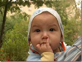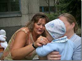 We were glad that the result was favourable, and after the doctors visit, it was time for Bailey Venera to go back to her orphanage room for lunch and a nap. The doctor agreed to go to lunch with us, so we headed downtown. Slava suggested the cafeteria associated with the grocery store, but the Dr thought that it was too plain/normal so he suggested we walk down the street and see what we could find. We had plenty of time until our afternoon visit, so we thought it was a great idea. Slava was nervous, but we reassured him that it would be fine, and that we'd meet him at our hotel at the appointed time. So we headed down the street with the good Dr. and it was our first experience of Ekaterinburg as a real town, mingling (so to speak) with the locals, and noticing the stores and restaurants and businesses. Dr. Downing picked a spot that looked to me to be a favourite of "new Russians" as outside the restaurant, were parked a Range Rover, an Audi and a Mercedes, and there was a doorman who seemed to be there to make sure you were of a certain caliber to enter! We were seated on the upper level of 2 levels, by a waiter who spoke perfect English, but after a couple of minutes, we were escorted to a "cooler" table in the lower restaurant. The menu was primarily Italian dishes, and was written in Russian AND English. The prices were comparable to Canadian prices but a little cheaper. I ordered fresh pressed apple juice, a long island iced tea, and medallions of beef, while Maureen had a beer and seafood stuffed trout. Dr Downing had a T-bone steak, and a beer and some vodka "straight-up, as Russian do". It was a terrific meal, and the service was relaxed and attentive, though we were in the restaurant for over 2 hours. At the next table was a "new Russian" who had 3 business meetings during the course of our lunch. He had a stylish silk suit, a Versace branded T-shirt and managed to eat something during eat meeting (hushed conversation, architectural plans, good looking (but non-talking) girlfriends etc). Maureen liked it, although I found the restaurant made me feel a little uncomfortable. It felt like we were cheating on our Russian experience, although this was definitely part of the experience. (I swear I saw 1 young male individual, and 1 table of 3 young males "escorted" out, or at least made to feel uncomfortable, so that they left on their own.A little odd). But it was very good food, and our part of the meal came to about $40. We got back to the hotel, with about 15 minutes to spare before our return trip to the orphanage for our afternoon visit.