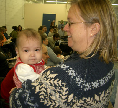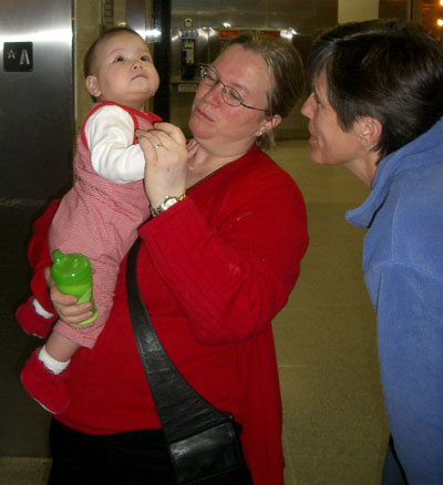 Friday Nov 14 - TorontoMaureen and Bailey arrived home safely in the evening of Friday November 14, 2003. I was happy that Maureen and Bailey were home, but it wasn't particularly joyous! Both Maureen and Bailey were crying. Maureen crying because one of her suitcases was lost, and it contained the formula that Maureen had obtained in Russia. She was certain that that was all that Bailey would eat, and consoling by the Customs staff, and myself, didn't help much. Bailey was probably crying because Maureen was crying, and with all the unfamiliar faces greeting her, it was a little too much. Even me, whom she had gotten to know in Russia, was unable to comfort her, and she just wanted Mom... Toronto Airport arrival images, November 14, 2003