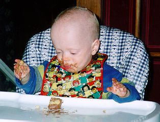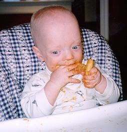 around the dining room. He is eating pureed baby food, and breadsticks,