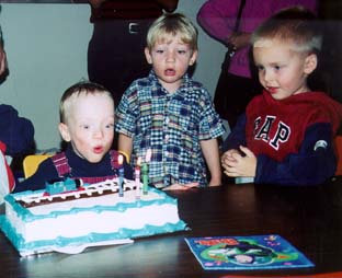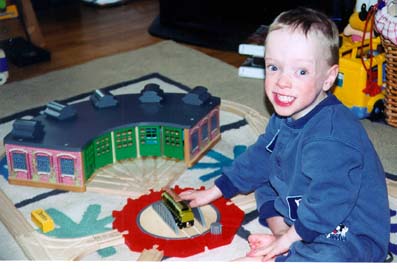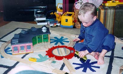 Playing with the Roundhouse that Grandpa Morley gave him.