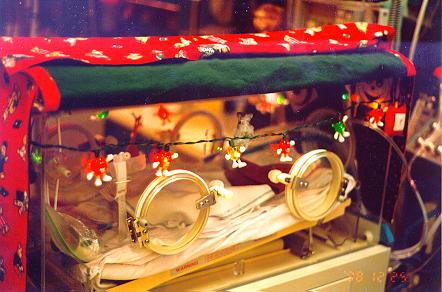 Sullivan's incubator, decorated with lights and ornaments: